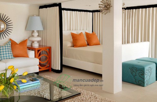 Dù những tấm rèm là vải mỏng, có thể nhìn xuyên qua, nhưng bạn vẫn có thể tạo được sự phân chia các khu chức năng trong nhà.