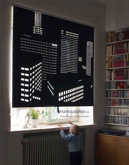 Bộ rèm cửa thiết kế độc đáo, có hình cảnh đêm lung linh với những tòa nhà chọc trời trên nền đen.